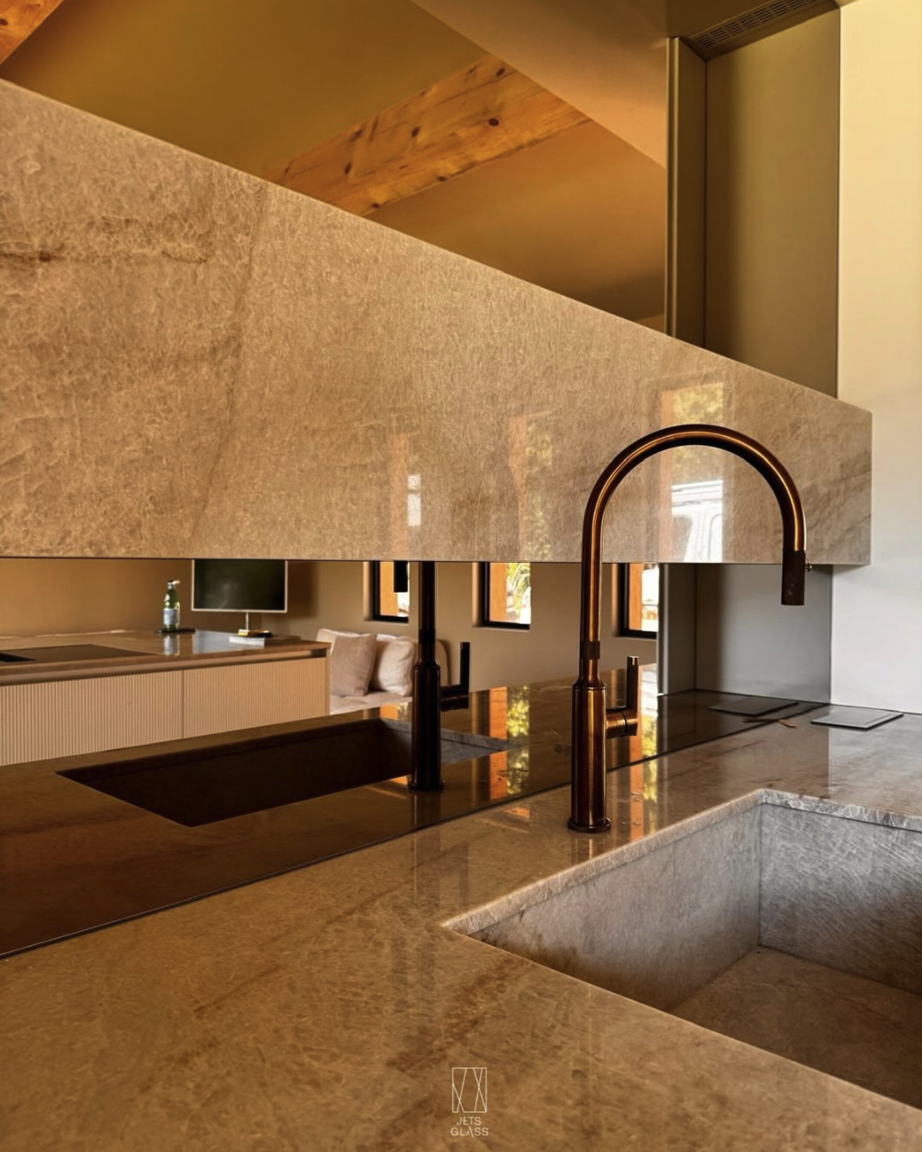 Cette crédence miroir bronze incarne le mariage réussi entre design, fonctionnalité et exigence esthétique