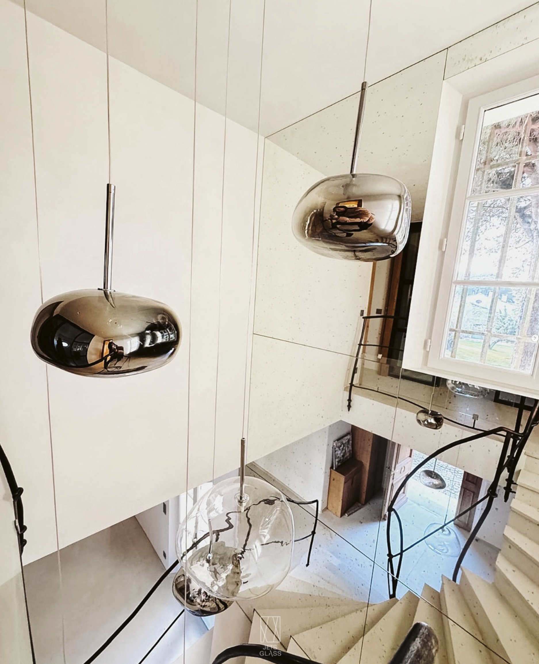 Cet habillage total de mur en miroir antique apporte caractère et profondeur à cette réalisation d’exception